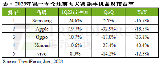 受惠旗艦機Galaxy S23系列上市,三星(Samsung)第一季智能手機產量達6,150萬支,環比增長5.5%,第二季由于新機上市的熱度減退,預估第二季產量環比衰退近10%。蘋果(Apple)第一季智能手機產量共計5,330萬支,環比減少32.9%,其中iPhone 14系列新機生產比重約78%,優于去年同期,展望第二季,由于是新舊機種交接的過渡期,預估產量將環比減少約20%。