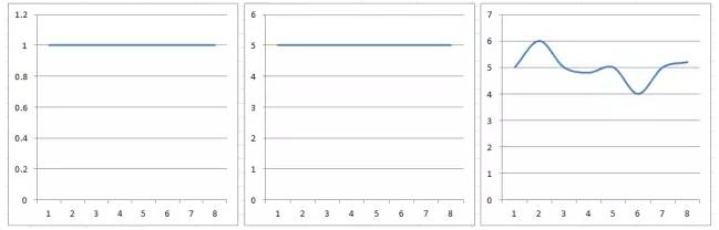 如果一個放大倍數為5的放大器,輸入恒定的1V電壓(波形如下左圖),則輸出應該始終是5V(波形如下中圖),既不會隨時間改變,也不會隨溫度而變化,輸出和輸入的電壓形狀完全一樣。但如果放大倍數不穩定,不斷變化,原先輸入的信號就會變形(如下右圖),信號可能由一條水平直線變成了一條曲線。這種波形變化叫做失真。