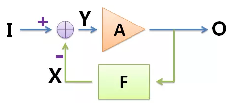 方框F是反饋器件,表示從輸出O取出信號,并將其與F相乘,得到 X ,所以 X=0*F ,這里 F<1 (這個部分在實際電路中可以用電阻實現);