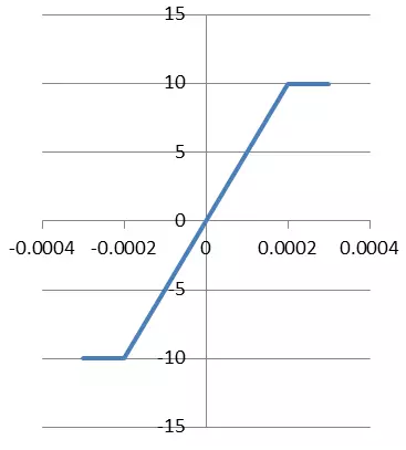 運放開環增益A常常高達幾十萬~幾百萬,但運放的輸出電壓受電源電壓限制,不能超出電源電壓。于是運放的輸入-輸出關系類似下圖形狀。