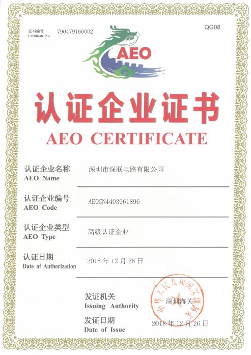 深聯電路2018年底首次榮獲得了AEO高級認證,因為有了海關AEO高級認證,不僅我們企業進出口貨物查驗更少、通關更快、手續更簡化、通關流通費用減少等,同時還與國際接軌,享受與我國開展AEO互認的國家和地區提供的通關便利。
