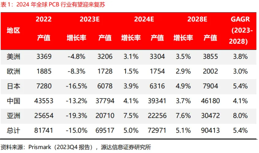 2024年全球PCB行業產值有望迎來回升。2023年受宏觀經濟及電子行業景氣度不佳影響,PCB行業產值出現一定回落。根據Prismark估測,2023年全球/中國PCB產值分別約為695/378億美元,同比分別下降約15.0%/13.2%。展望2024年及未來,人工智能、汽車電子等行業將有效支撐PCB行業需求,疊加電子行業本身的周期復蘇,預計2024年全球/中國PCB行業產值將分別達約730/393億美元,同比分別增長約5.0%/4.1%。