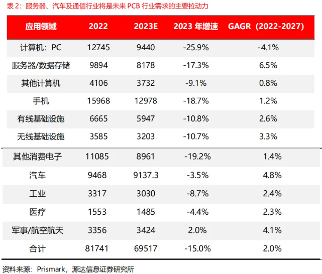 服務器/數據存儲、汽車及通信行業未來增速更為強勁。從PCB下游應用領域看,2023年計算機、手機等消費電子行業需求下降最為顯著,導致2023年全球PCB行業產值下跌。未來在人工智能行業高速發展下,服務器/數據存儲行業有望成為PCB行業需求最為強勁的支撐方。此外,汽車電子、通信及消費電子行業也將有效拉動PCB行業產值回升。