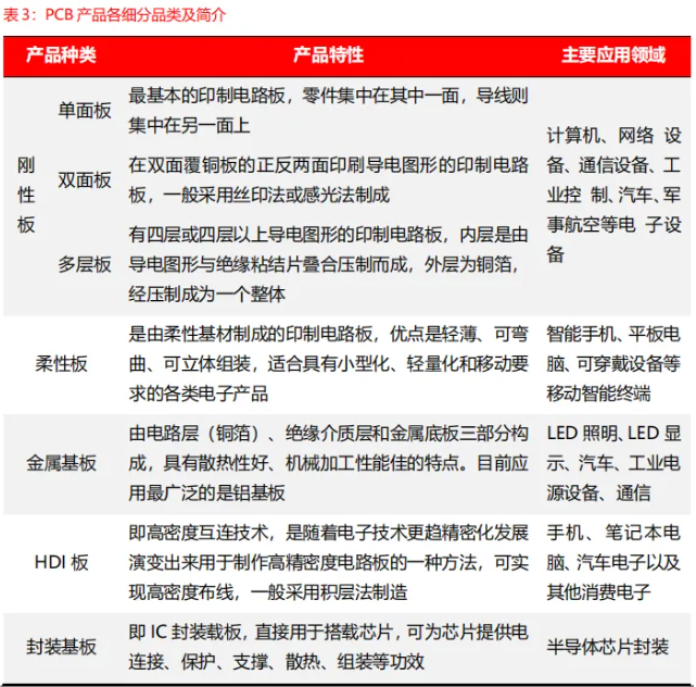 PCB產品多樣化,具備結構升級趨勢。PCB產業歷史悠久,應用領域滲透到電子產業的方方面面,覆蓋行業包括通訊設備、計算機及網絡設備、消費電子、汽車電子、工業控制及醫療等。PCB產品可細分為剛性電路板、柔性電路板、金屬基板、HDI板和封裝基板等品類。其中HDI板和封裝基板等屬于高端PCB產品,在高端消費電子、服務器和芯片等領域得到廣泛應用。