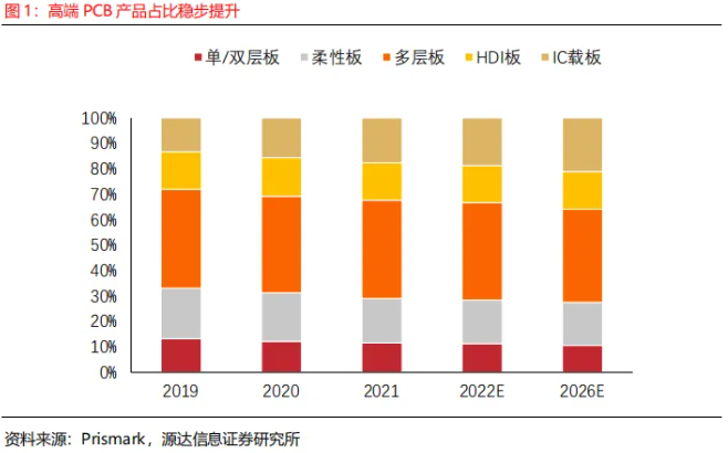 高端PCB產品結構占比逐步提升。受服務器/數據存儲、手機等高端消費電子行業的拉動,HDI板和IC載板等高端PCB產品占比逐步提升。根據Prismark數據,2022年單/雙層板、柔性板、多層板、HDI板和IC載板的占比分別為11.3%、17.2%、38.4%、14.6%和18.8%,并預計在2026年占比結構變為10.6%、16.9%、36.6%、14.8%和21.1%。