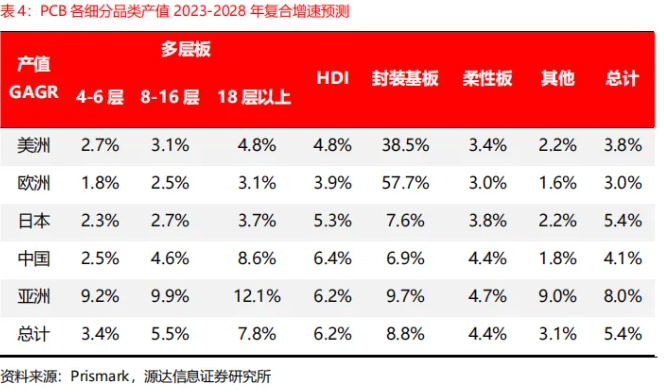 人工智能等行業對PCB產品集成度、復雜度和精細度要求的持續提升,將帶動HDI板和封裝基板等高端PCB產品占比的提升。根據Prismark數據預測,預計封裝基板、HDI板和18層以上的多層板2023-2028年的產值復合增速分別為8.8%、6.2%和7.8%。此外在封裝基板領域,由于產能主要由歐美及日韓企業占據,因此國內封裝基板產值增速遠低于美洲和歐洲,目前國內PCB企業已在加大對封裝基板的產能擴充力度。