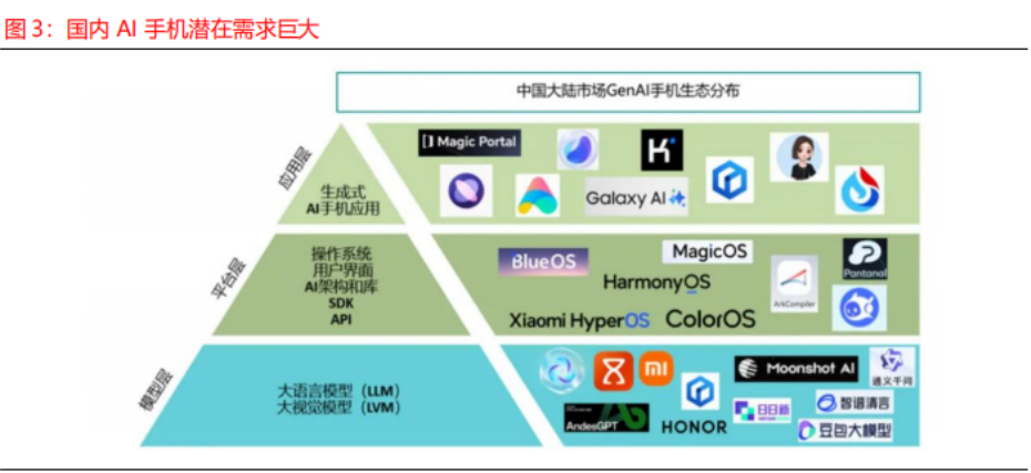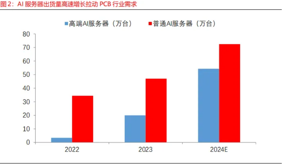 2023年底起AI手機出現高速發展。國內市場基于高端用戶基礎和市場壁壘,AI手機潛在需求巨大。小米、vivo等廠商已在2023Q4推出AI手機,2024年Q1中國大陸市場中,AI手機出貨量已達1190萬部,占全球AI手機出貨的25%,僅次于美國。預計AI手機在國內將迎來高速發展,推動消費電子行業復蘇。此外與AI手機配套的AI應用及相關大模型也將匹配發展,并意味著大額的算力需求,即對AI服務器的數量需求。上述趨勢均有望利好PCB產業發展。