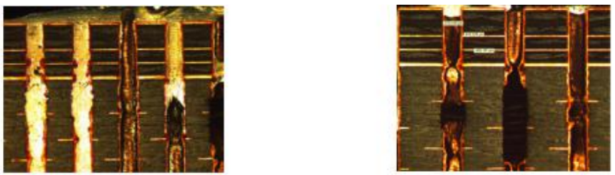 解決方案:高速發(fā)展是趨勢(shì),孔環(huán)會(huì)越來(lái)越小,為減少焊盤(pán)起翹或 PP 層開(kāi)裂缺陷,需 要在樹(shù)脂流動(dòng)性和壓合工藝參數(shù)上進(jìn)行工藝優(yōu)化。