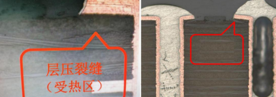 高速高頻PCB 為減少信號(hào)損耗,希望采用高速材料,并且孔環(huán)盡可能小,從孔環(huán)5.0mil 減小到3.0mil,但高速材料銅箔與樹(shù)脂結(jié)合力比常規(guī)FR4 材料要低,再使用小孔環(huán),PCB 在經(jīng)過(guò)回流或波峰焊時(shí),由于熱應(yīng)力沖擊,就發(fā)生焊盤(pán)起翹或表層PP 樹(shù)脂開(kāi)裂缺陷,見(jiàn)下圖2-5。