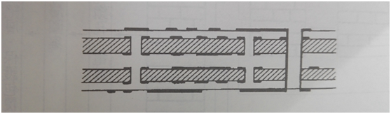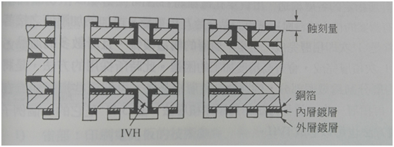 埋孔如圖2-2所示,在內層使用薄型的積層板,用雙面板的制造程序作出貫穿孔電鍍的板子,以它作為內層而積層成形。再次薄型積層板上做貫穿孔電鍍時,要非常注意電鍍掛架及各種運送作業的處理。用多層板取代雙面板的配置也是可能的,這樣可以做出更復雜的印刷電路板。