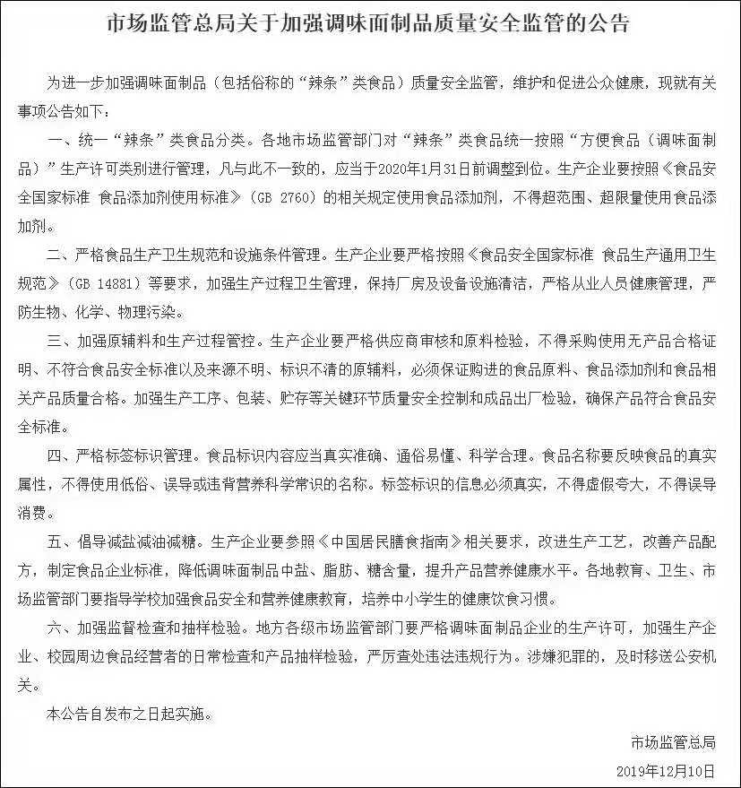 12月10日,國家市場監督管理總局發布“關于加強調味面制品質量安全監管”的公告(以下簡稱“公告”),從統一“辣條”類食品分類、加強原輔料和生產過程管控、倡導減鹽減油減糖等六個方面對加強調味面制品質量安全監管提出要求。