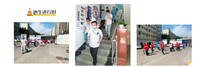 各部門員工在聽到警報響起后,迅速往逃生出口逃跑,并到指定地點集合。