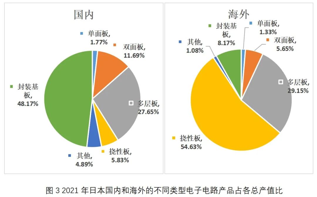 據軟板廠了解,從細分產品看,除撓性板以外,其余類型產品國內比重均高于海外,其中封裝基板在國內生產比重達86.2%,在海外生產比重僅13.8%。撓性板在海外生產比重為89.8%。從不同產品在日本國內和海外的產值占比情況看,封裝基板產值占日本國內總產值48.2%,占海外總產值僅8.17%;多層板占日本國內總產值27.7%,占海外總產值29.2%;撓性板占日本國內總產值5.8%,占海外總產值54.6%。