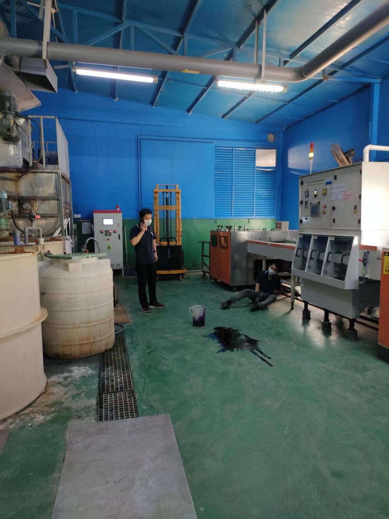 深聯電路軟硬結合板廠B棟1樓電鍍旁膜渣房里,環保員工在添加藥水過程中,意外導致藥水桶破裂泄漏地面,藥水濺到身上至此受傷。?