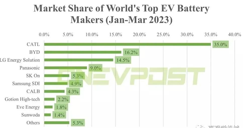 在全球電動汽車電池供應商榜單中,中國的寧德時代和比亞迪包攬冠亞軍,合計市占份額超過50%,兩家中國企業繼續占據全球動力電池裝車量的半壁江山。