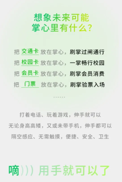刷掌坐地鐵只是試水,此前2023微信公開課PRO·微信之約于3月28日開講,騰訊公司副總裁、微信支付負責人張穎介紹了微信支付開始嘗試推出的“微信刷掌”服務,用創新科技帶來更便捷的生活新體驗。用戶將會員卡、校園卡、交通卡、門票電子碼等與手掌綁定,即可刷掌驗證會員身份、便捷消費、過閘通行。目前正在逐步邀請商家聯合打造刷掌應用場景。