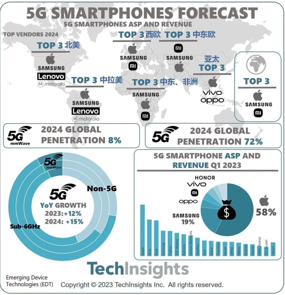 5G線路板廠了解到,研究機構TechInsights近日發布報告,表示2024年5G智能手機滲透率預計將增長至72%。2023年上半年智能手機市場不景氣,許多品牌一季度銷量同比有兩位數的下跌,不過隨著消費回暖,預計5G智能手機市場將在今年年底和2024年恢復兩位數的增長。