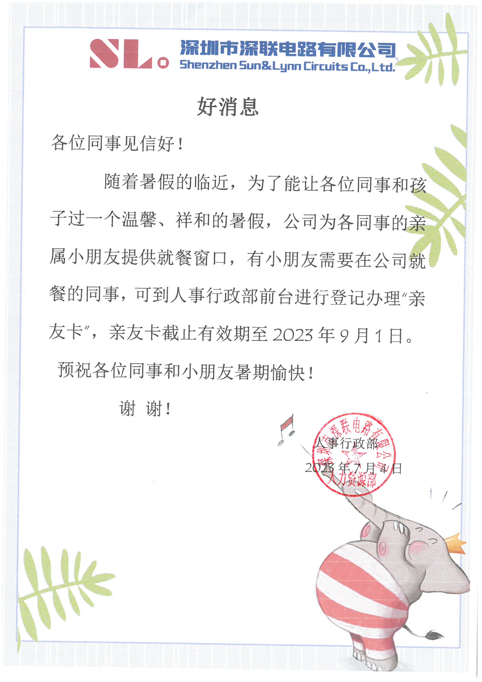 為感謝大家對公司所付出的不懈努力,提高員工生活質量,解決員工家屬就餐問題。經公司決定,暑假期間,公司為各位深聯人的親屬小朋友提供就餐窗口,可到人事行政部前臺登記辦理”親友卡”,有效期截止至2023年9月1日哦!心動不如行動,趕緊來報名吧! (ps:僅限深圳深聯電路在職員工報名哦!)