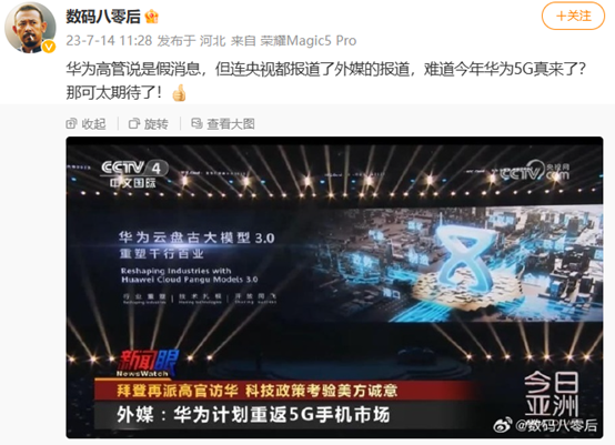 無獨有偶,博主@數碼八零后表示,華為高管說是假消息,但連央視都報道了外媒的報道,難道今年華為5G真來了?