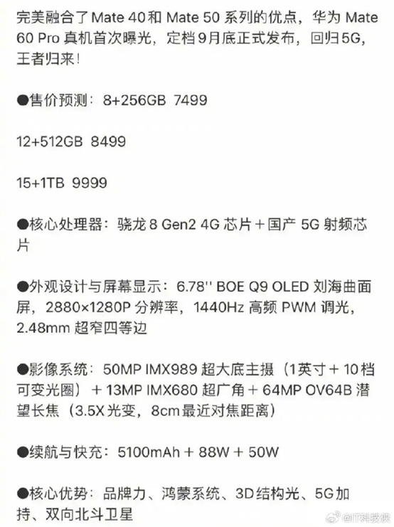 爆料稱,Mate 60預計9月底正式發布,搭載驍龍8 Gen 2 4G處理器(國產5G射頻芯片)和6.78英寸劉海曲面屏(2.48mm超窄四等邊)。同時還有5000萬像素(IMX989、10檔可變光圈)主攝,提供5100mA容量電池(88W有線和50W無線),搭載鴻蒙4.0系統,雙向支持北斗等等。