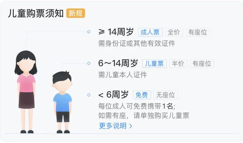 且不單獨(dú)占用席位可免費(fèi)乘車,一名成年人僅限攜帶一名兒童,超過則需要額外買兒童優(yōu)惠票。