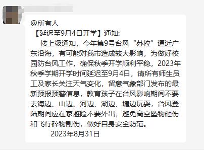 深圳教育發(fā)布:受“蘇拉”影響全市中小學(xué)、幼兒園,秋季學(xué)期開學(xué)時間,從9月1日推遲至9月4日,各高校要適當(dāng)調(diào)整學(xué)生返校時間,確保在校師生安全,停止一切非必要的戶外活動。請大家做好防風(fēng)防雨措施,減少外出!