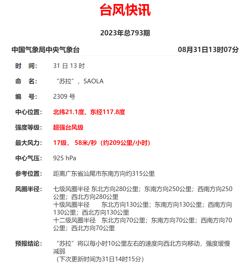 今年第9號臺風(fēng)“蘇拉”(英文名稱:Saola;名字來源:越南;名稱意義:越南最近發(fā)現(xiàn)的一種罕有的珍貴動物)8月24日14時生成。8月26日14時,加強為強臺風(fēng)級,8月29日下午,再次加強為超強臺風(fēng)級。