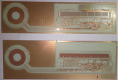 首先,在“基材+透明膠+銅箔”這種原材料上,對銅箔進行化學刻蝕等工藝處理,得到想要的導電圖形電路;然后,在“保護膜+透明膠”這種原材料上,對保護膜進行鉆孔以露出相應的焊盤;在清洗之后,再用滾壓法把這兩種原材料結合起來;最后,在露出的焊盤部分進行電鍍金或錫以保護板子。就這樣,一整塊單層FPC就做好了,根據需要,一般還會繼續對一整塊軟板進行沖壓,分成相應形狀的小軟板。