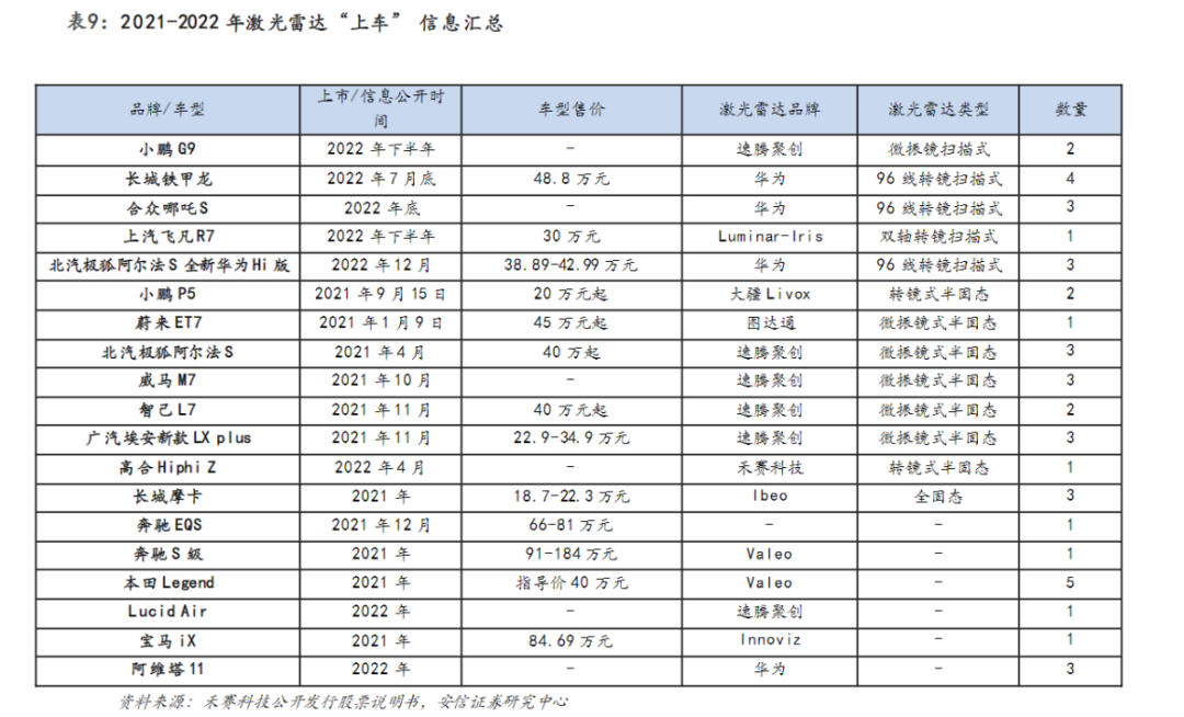 (2)裝配激光雷達的幾款代表性車型:2022 年開始,蔚來 ET7、小鵬 G9、沃爾沃XC90 等使用激光雷達的車型將逐步交付。但受限于高階自動駕駛滲透率提升不及預期(激光雷達成本昂貴,一般在L3級以上的高階自動駕駛才會配備),激光雷達上車進程 2022 年表現一般。