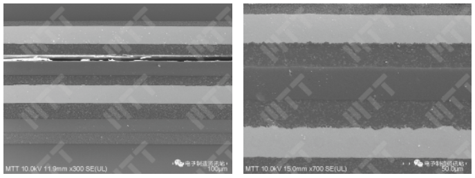失效FPC鼓包位置切片后,均發現界面分離現象,分離位于粘合劑與PI膜之間;OK FPC切片后均未發現界面分層現象。