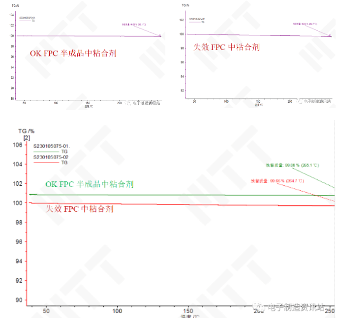 圖5. 失效FPC及OK FPC半成品中粘合劑TGA測試結果