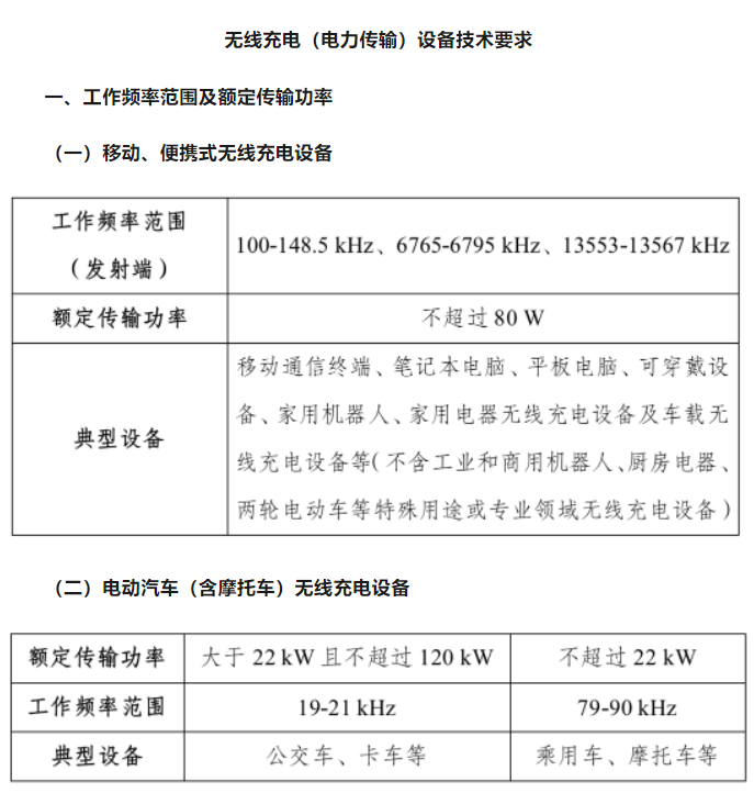 2021年,工信部發(fā)布了一份《無線充電(電力傳輸)設(shè)備無線電管理暫行規(guī)定(征求意見稿)》(簡稱《規(guī)定》),其中第四條明確表示:移動和便攜式無線充電設(shè)備應(yīng)當(dāng)工作在100-148.5kHz、6765-6795kHz、13553-13567kHz頻段,且額定傳輸功不超過50W。