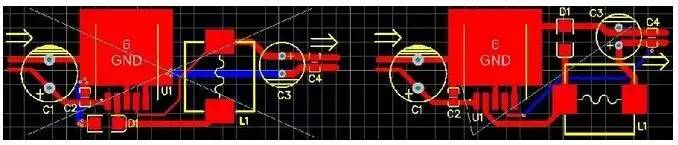 還有就是電壓檢測的反饋線引入點問題,應該是經過濾波后的地方反饋回去,不然會使輸出的電壓紋波更大。這兩點是我們很多PCB設計人員經常忽視的地方,以為同一個網絡,接在那兒不是一樣,其實接的地方不一樣,性能影響是很大的。圖4是LM2575開關電源PCB圖,大家看看錯的那幅圖是哪里錯了。