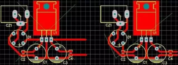 圖2是上面原理圖的PCB圖,兩個圖相似。左圖和右圖就是走線有點不一樣,左圖的電源經整流后直接就到了穩壓芯片的輸入腳了,然后才是穩壓電容,這里電容所起的濾波效果就差了很多,輸出也有問題。右圖就是比較好的圖了。我們不僅要考慮正電源的流向問題,還必須考慮地回流問題,一般來說,正電源線和地回流線要盡可能同進同出,彼此離近點。