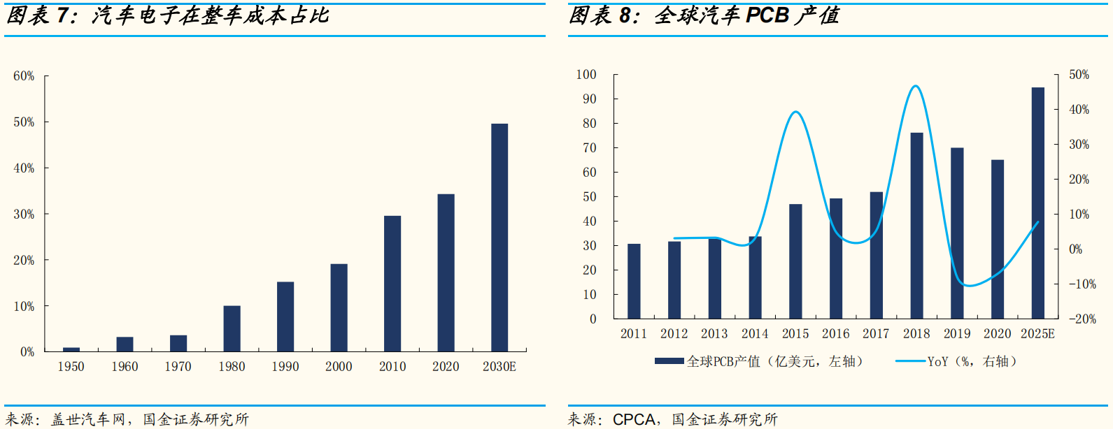汽車的電動化和智能化的底層硬件支撐就是汽車電子模塊,電子化使得汽車電子成本占比不斷提升,預計到2030年汽車電子成本占比將接近50%,而PCB作為電子之母,其在汽車上的應用也將明顯提升,根據CPCA預計,2025年全球汽車PCB產值將達到95億美元,2020~2025年的復合增速將達到7.8%。