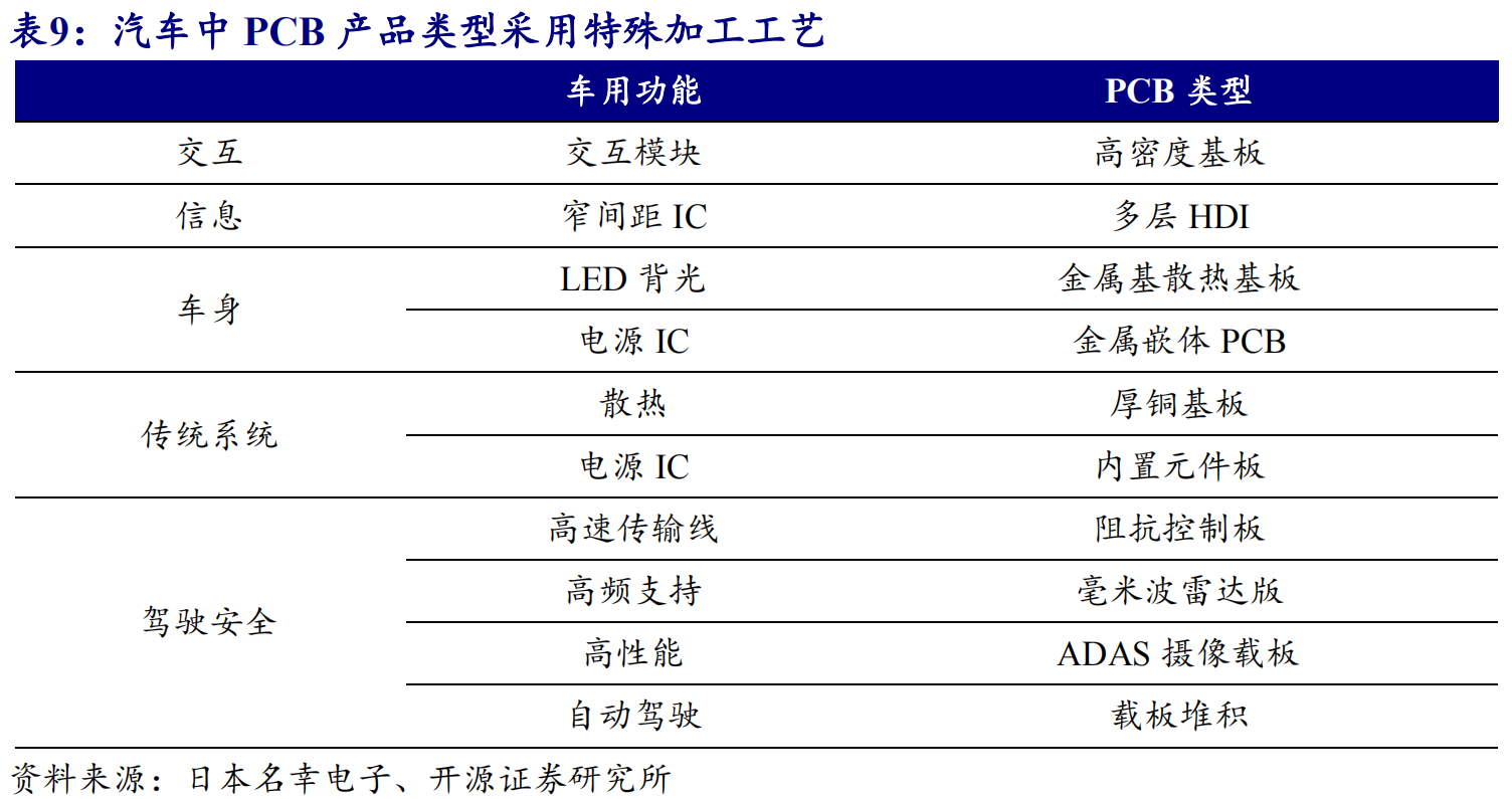 汽車電動化與智能化的趨勢下,PCB方案呈現多元化。從傳統以4-6層多層板為主的方案向 HDI、金屬散熱基板、厚銅基板、內置元件板等PCB方案演進,單車的PCB用量增加且技術難度上升。