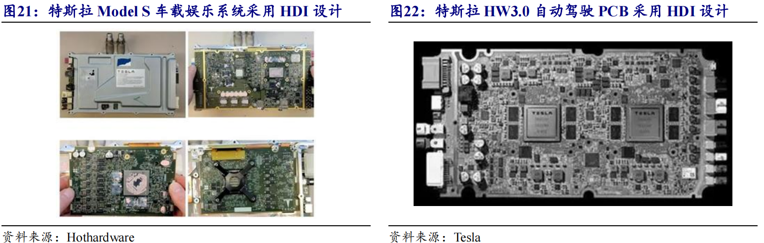 車內智能座艙將多個不同操作系統和安全級別的功能融合,滿足觸控/智能語音/視覺識別/智能顯示等多模態人機交互,AR-HUD、電子外后視鏡等方案涌現。高度集成、超強運算性能,推動HDI用量增加。車載娛樂系統、自動駕駛主控、車載服務器等核心環節的PCB通常采用高速材料,10層以上3階HDI設計。