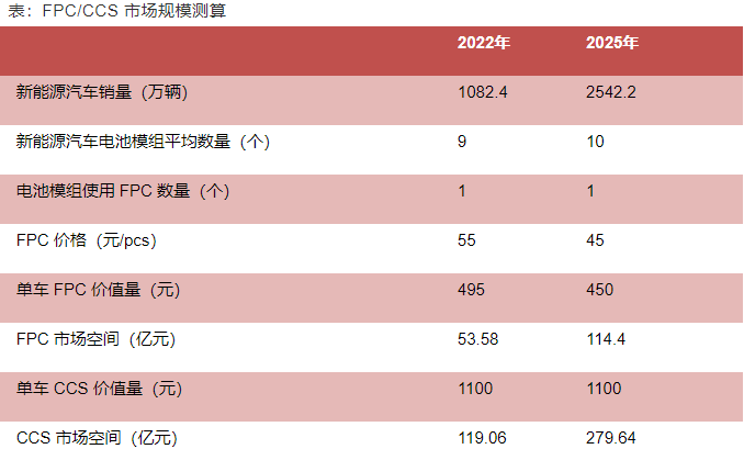 我們根據這一新能源汽車銷量預測數據,對 FPC/CCS 的市場空間進行測算: