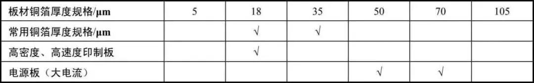 常見板材銅箔厚度及選擇如下表所示。
