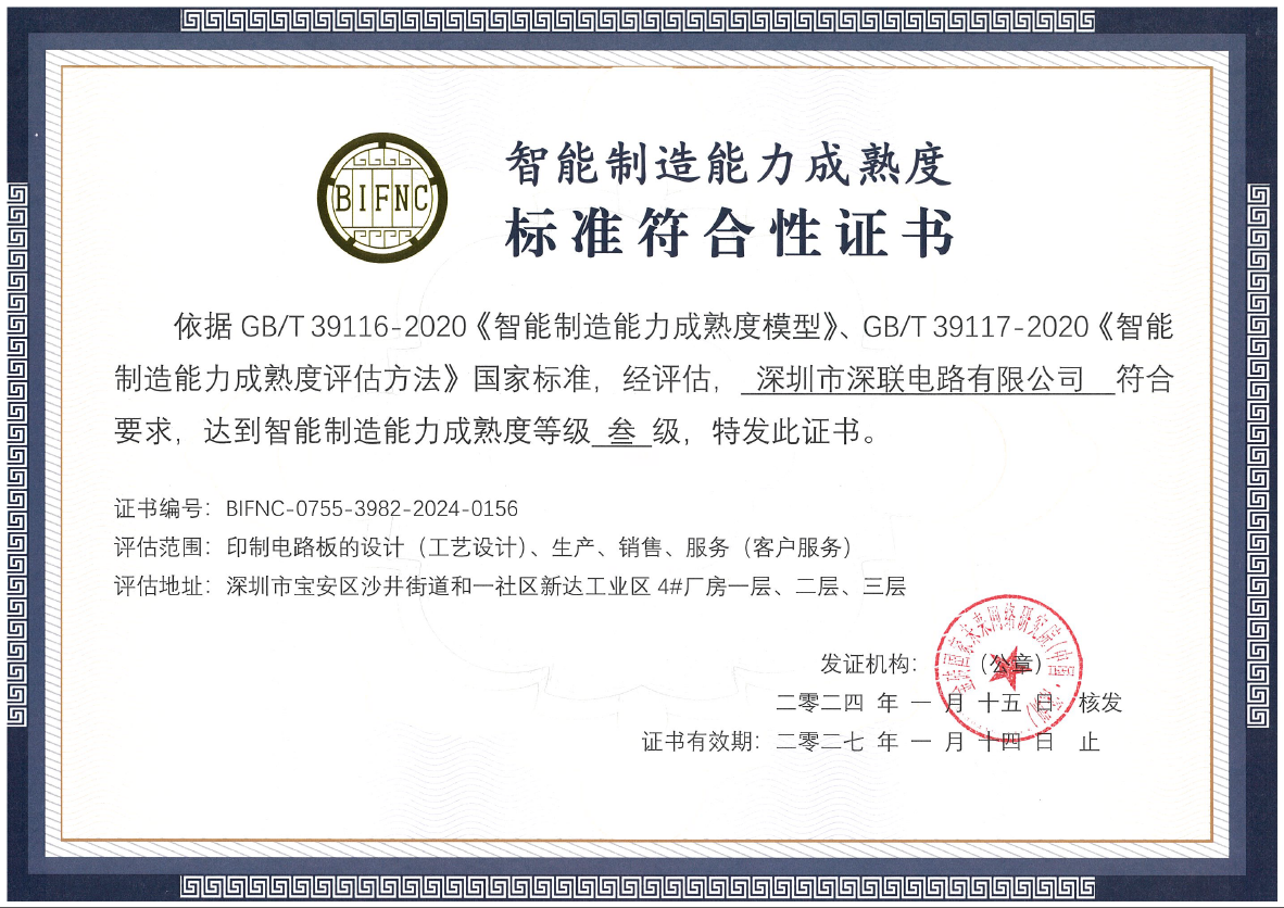 深聯電路PCB廠一直致力于智能制造、打造技術創新和數字化轉型,推動公司產業的升級和發展。此次認證對深聯電路智能制造能力水平進行了客觀評估,既有助于深聯電路全面了解當前的智能制造現狀,又明確了算了算了改進的方向,基于成熟精益制造,讓數字化的技術發揮最大的作用,從而實現更高層次的制造效率和質量。