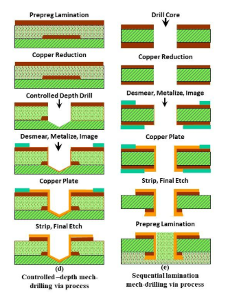 可以鉆取更大的過(guò)孔,但由于需要較慢的鉆孔速度,吞吐量較低,其成本最終會(huì)超過(guò)激光鉆孔成本。激光鉆孔是迄今為止最流行的微孔形成工藝,但它并不是最快的過(guò)孔形成過(guò)程。小孔的化學(xué)蝕刻是最快的,估計(jì)速度為每秒 8,000 到 12,000 個(gè)過(guò)孔。等離子孔形成和光孔形成也是如此。在激光鉆孔中,使用高注量光束在PCB層壓板上放置一個(gè)孔。激光能夠燒蝕介電材料并在攔截銅電路時(shí)停止,因此它們非常適合創(chuàng)建深度受控的盲孔。激光能量的波長(zhǎng)處于紅外和紫外線區(qū)域。光束點(diǎn)尺寸小至約20微米如果電路板中的過(guò)孔足夠?qū)捯赃M(jìn)行鉆孔,則可以使用受控的鉆孔步驟來(lái)放置過(guò)孔。這需要一個(gè)中間順序?qū)訅翰襟E來(lái)粘合兩層電路板,然后進(jìn)行鉆孔和電鍍以界定過(guò)孔管、與內(nèi)層的連接以及上層的著陸焊盤。這些過(guò)孔也可能在下一個(gè)順序?qū)訅翰襟E之前被填充(如果它們位于內(nèi)層),或者在保留在外層的情況下選擇不填充。整體鉆孔和順序過(guò)程如下所示。
