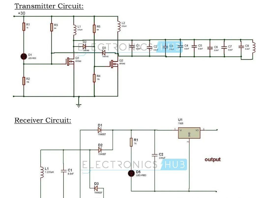 該電路主要利用互感原理工作。根據 "電感耦合 "原理,電源通過無線方式從發射器傳輸到接收器。
