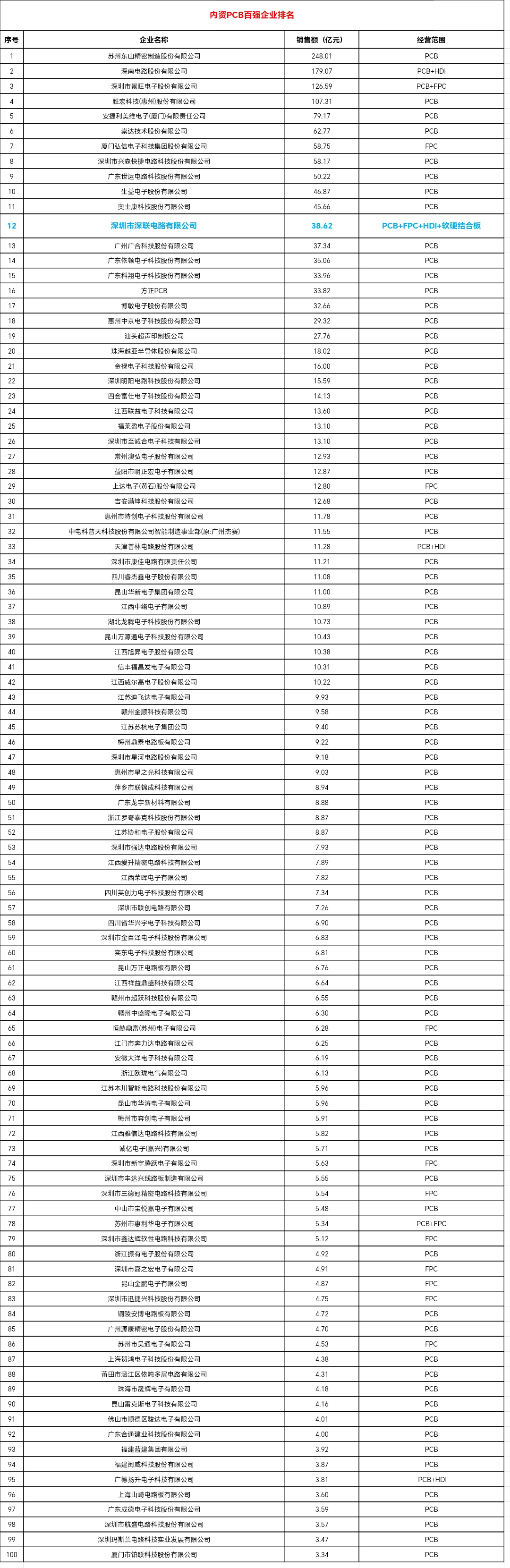 深聯小編還特別為大家整理了PCB行業權威榜單,包括綜合PCB百強企業和內資PCB百強企業名錄,以下為入選的優秀企業名單,歡迎查閱貴司排名情況!