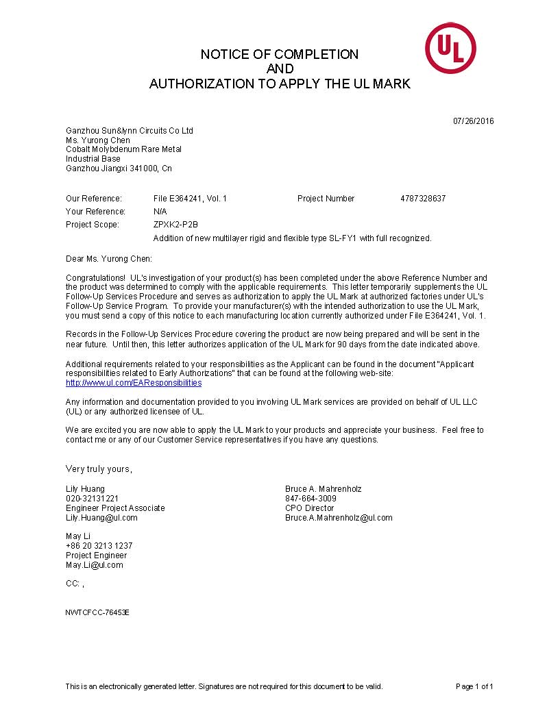 號外 號外 ……,贛州深聯軟硬結合板通過UL認證了,話不多說,上圖: