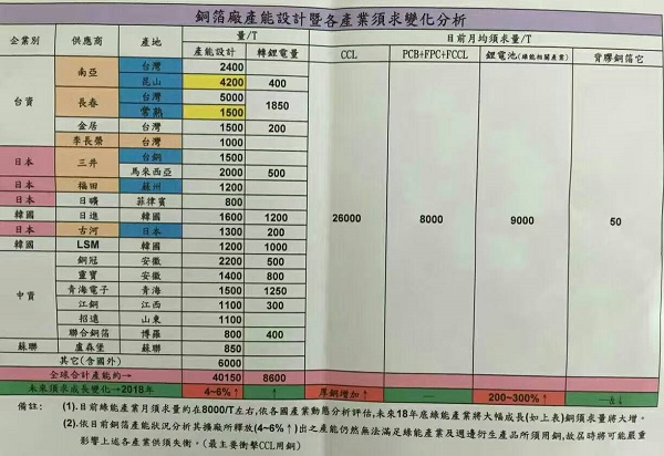 預計到2018年,鋰電池銅箔需求量大幅增加200%-300%,而銅箔產能擴張速度4%-5%,無法滿足鋰電產業及周邊產品對于銅箔的需求,并將進一步導致其他產業,尤其CCL的銅箔供需失衡,進而引起相應銅箔供給價格上漲。