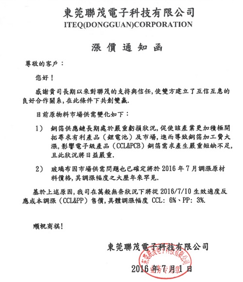 而銅箔占據覆銅板CCL材料成本的30%(厚覆銅板)-50%(薄覆銅板),覆銅板占據PCB生產成本的約40%,上游銅箔價格持續上揚將傳導至覆銅板產業及PCB產業。日前廣東生益、東莞聯茂等材料商均有發布漲價通知,對所有材料價格進行調整。