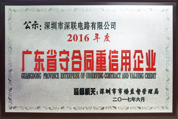 近日,深聯電路順利通過深圳市工商行政管理局評審,獲得“廣東省守合同重信用企業”的榮譽稱號,此舉肯定了信守經營、信用文化建設與良好客戶口碑。從2015年至此,這已是深聯電路連續兩年榮獲此項殊榮。