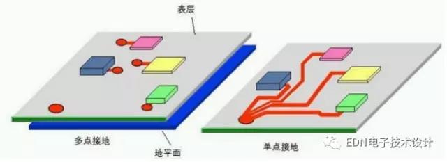 ① 單點接地:所有電路的地線接到地線平面的同一點,分為串聯單點接地和并聯單點接地。