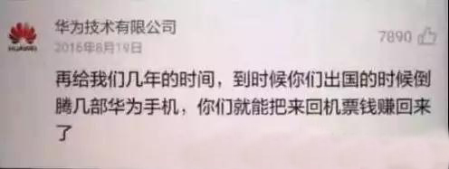 截圖顯示,華為官微寫道,“再給我們幾年時間,到時候你們出國的時候倒騰幾部華為手機,就能把來回機票錢賺回來了。”