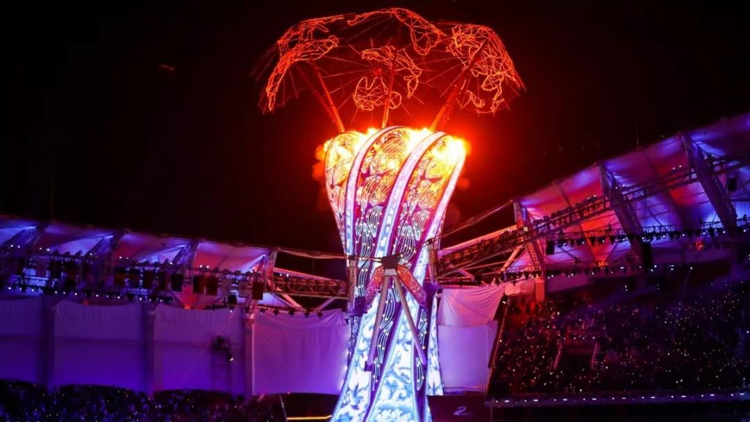 通過水池中的裝置點(diǎn)燃主火炬塔